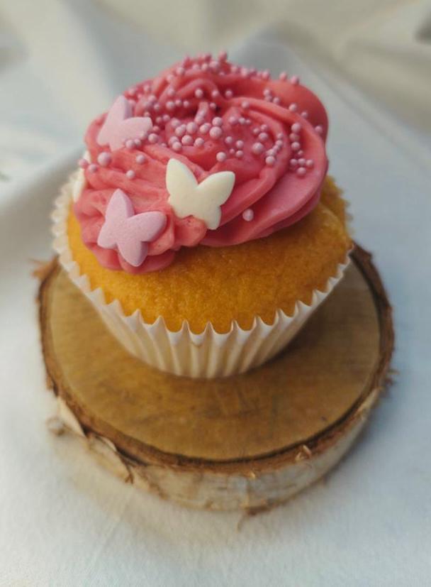 Cake vanille, cœur fraise ou framboise, crème au beurre à la meringue suisse, arôme fruits rouges